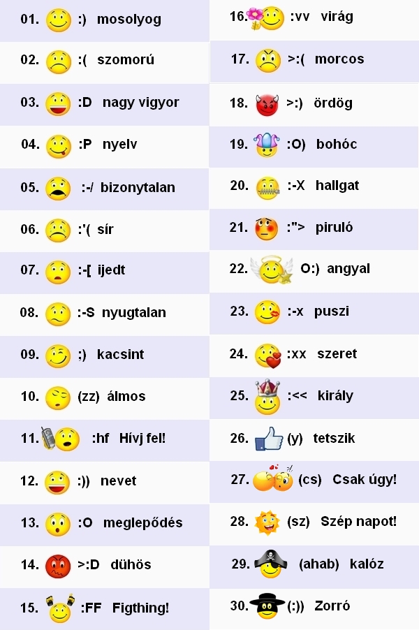 A fórum szövegszerkesztőjéhez rengeteg smileyt is összegyűjtöttem, végül ezeket a billentyűparancsokkal együtt egy összefoglaló táblázatban is megjelenítettem.